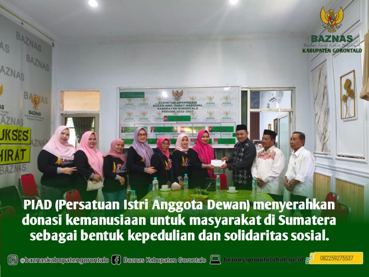 PIAD (Persatuan Istri Anggota Dewan) menyalurkan bantuan uang tunai bagi masyarakat di Sumatera yang terdampak musibah melalui BAZNAS Kabupaten Gorontalo. Kegiatan ini dilakukan sebagai bentuk kepedulian sosial dan solidaritas terhadap sesama yang sedang mengalami kesulitan.